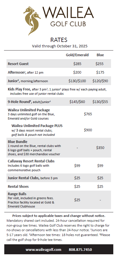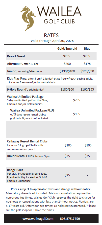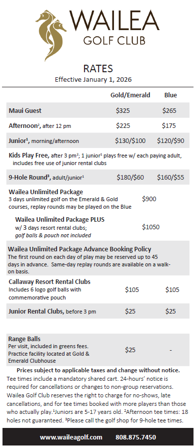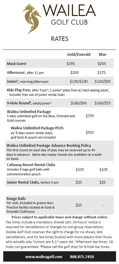 **9-hole tee times for 2 pm or later can be booked up to 45 days in advance. 9-hole tee times for play prior to 2 pm can be booked on the date of play only. To book a 9-hole tee time, please call our reservations department at 808-875-7450 ext. 1, or visit one of our golf shops.